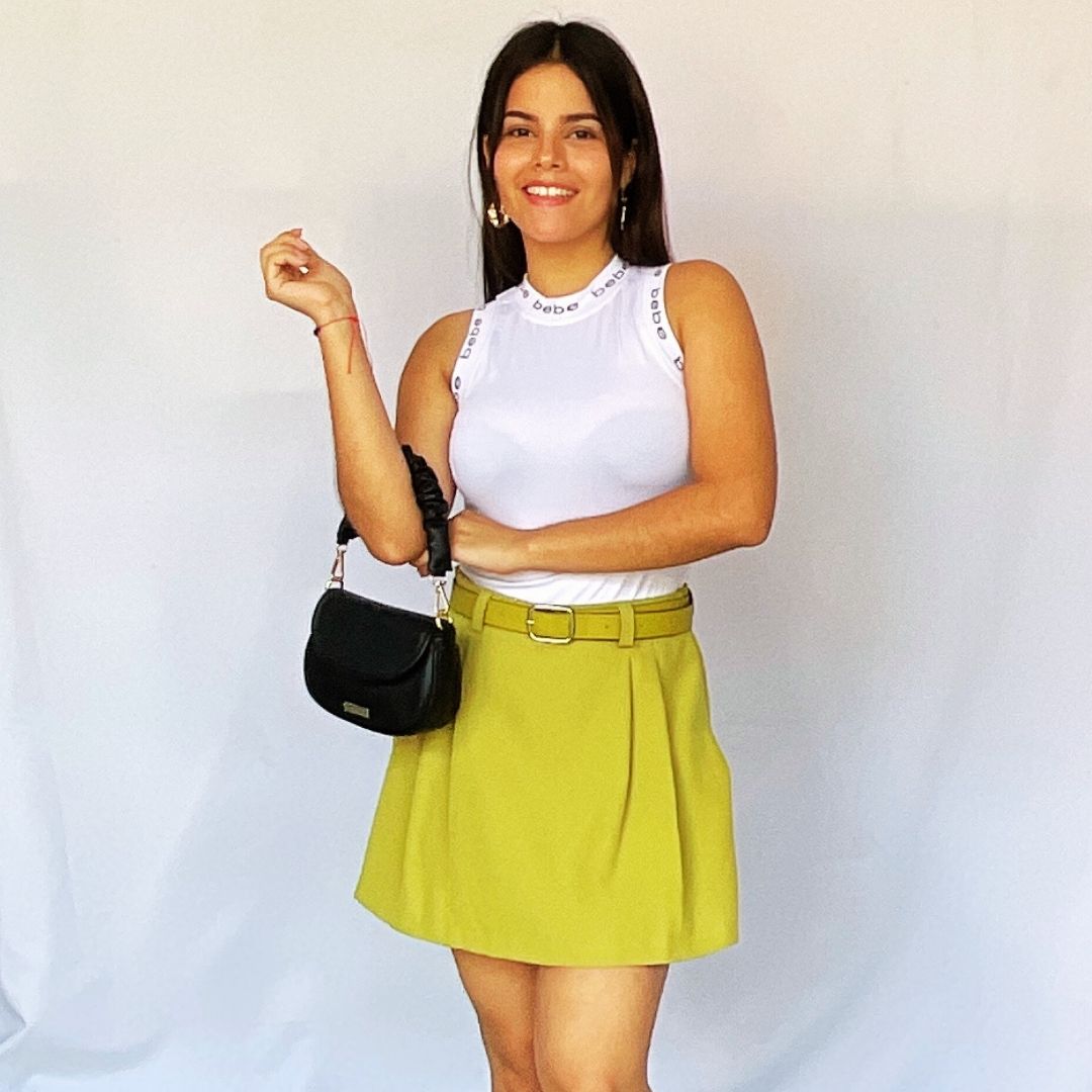 Luce un estilo fresco y juvenil con este vibrante conjunto casual. Incluye un top blanco sin mangas, confeccionado en un tejido cómodo y elástico, adornado con el logo de «bebe» repetido a lo largo del cuello. Se combina perfectamente con una mini falda plisada en un llamativo tono verde lima, que incorpora un cinturón a juego para un ajuste ideal. El look se completa con una elegante cartera de hombro en color negro, ideal para llevar tus esenciales. Este atuendo es perfecto para paseos de día, salidas informales o cualquier ocasión donde quieras destacar con un toque de color y modernidad.