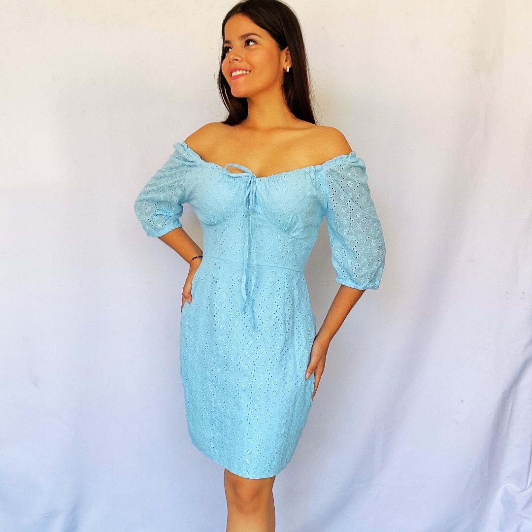 Vestido corto azul cielo con hombros descubiertos, escote con lazo y mangas tres cuartos, tejido con bordado inglés.